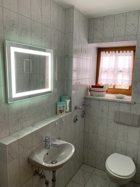 eine Gästetoilette, eine Küchenzeile, ein Esstisch mit Eckbank, Rundsitzgarnitur mit Couchtisch, Flachbildschirm - Kabel - TV, WLAN - Anschluß, Telefonstation, Stereo-/Radioanlage sowie ein Eichenschrank ( Breite 3m x Höhe 2,20m) mit 2 getrennt ausklappbaren Schrankbetten