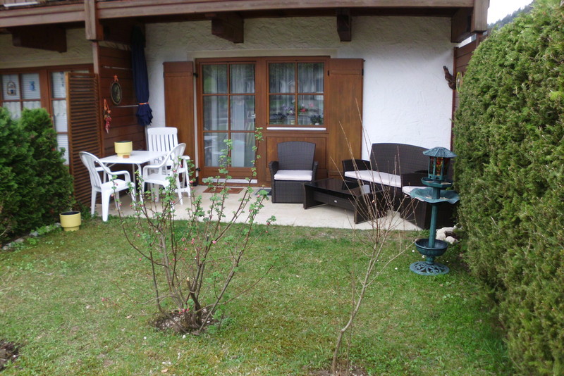 Vom Wohnbereich hat man einen direkten Zugang zur überdachten Gartenterrasse mit Gartenmöbeln und Liegewiese.